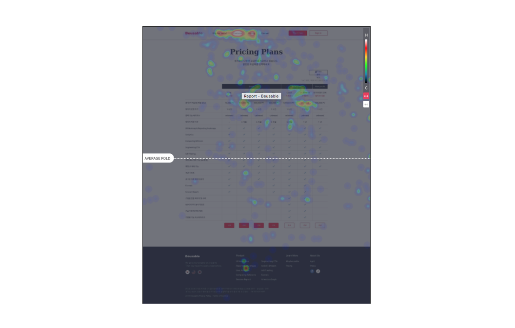 여기서 잠깐 설명해 드리자면 클릭률 1위인 Pricing은 가격정보를 알 수 있는 페이지, 2위인 Why Beusable?은 뷰저블 서비스의 강점을 소구하는 페이지, 3위인 Beusable은 메인 페이지입니다. 뷰저블의 더욱 상세한 기능을 알아볼 수 있는 페이지인 GNB 영역의 Features 페이지는 순위 사진에는 나와 있지 않지만 역시 클릭률 7위로 낮지 않은 순위였습니다.