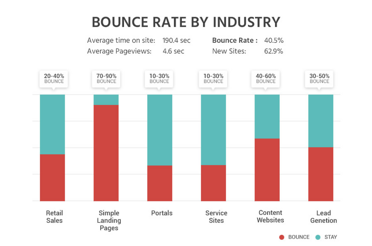 구글 애널리틱스 벤치마크에 따르면 평균적으로 40.5%의 이탈률이 발생하며 심플 랜딩 페이지의 이탈률이 가장 높다고 합니다. 다음으로는 콘텐츠 웹사이트, 잠재 고객 발굴 웹 사이트, 리테일 세일즈, 서비스 사이트 및 포탈 순입니다.
