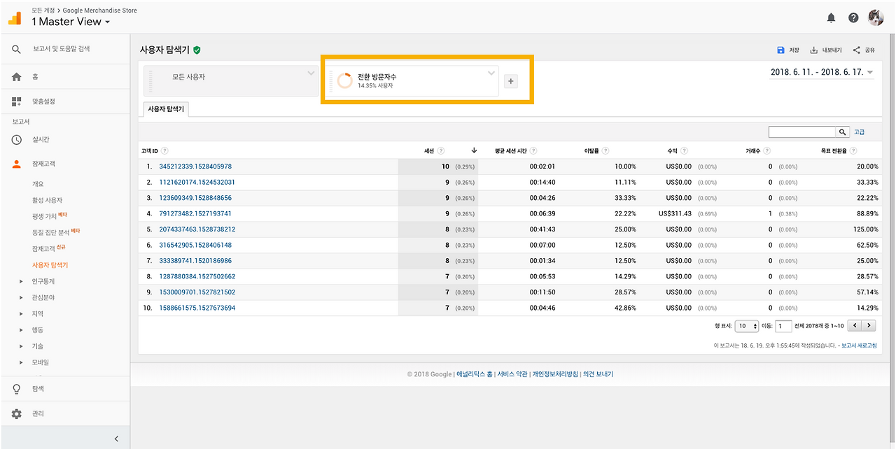 위치 : 구글 애널리틱스 보고서 > 잠재고객 > 사용자 탐색기 > 사용자 보고서
