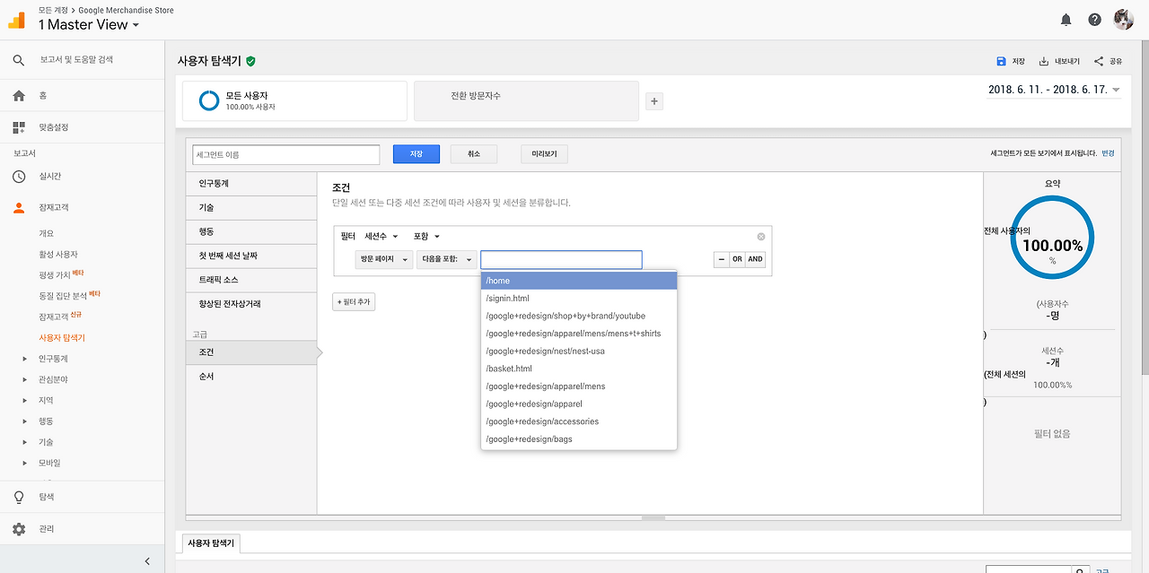 사용자 탐색기에서는 개별 사용자의 행동 로그를 분석할 수 있습니다. 마치 로우데이터처럼 나열되는 것이 특징입니다. 하지만 웹 사이트에 방문한 전체 사용자 데이터를 일일히 살펴볼 수는 없습니다. 그렇게 때문에 사용자를 세그먼트로 분류하여 '특정 행동을 한 사용자'가 누구인지 살펴볼 것을 권장합니다. 전자상거래 사이트라면 어떤 예가 있을까요? 상품 카테고리 페이지를 본 후 상품 상세 페이지를 보고, 장바구니 페이지로 바로 이동하지 않고, 상품 상세 페이지를 본 후 '찜 리스트'로 이동하는 경우가 있을 것입니다. 일반적인 시나리오를 벗어난 행동을 보인 사용자 행동을 찾아봅시다.