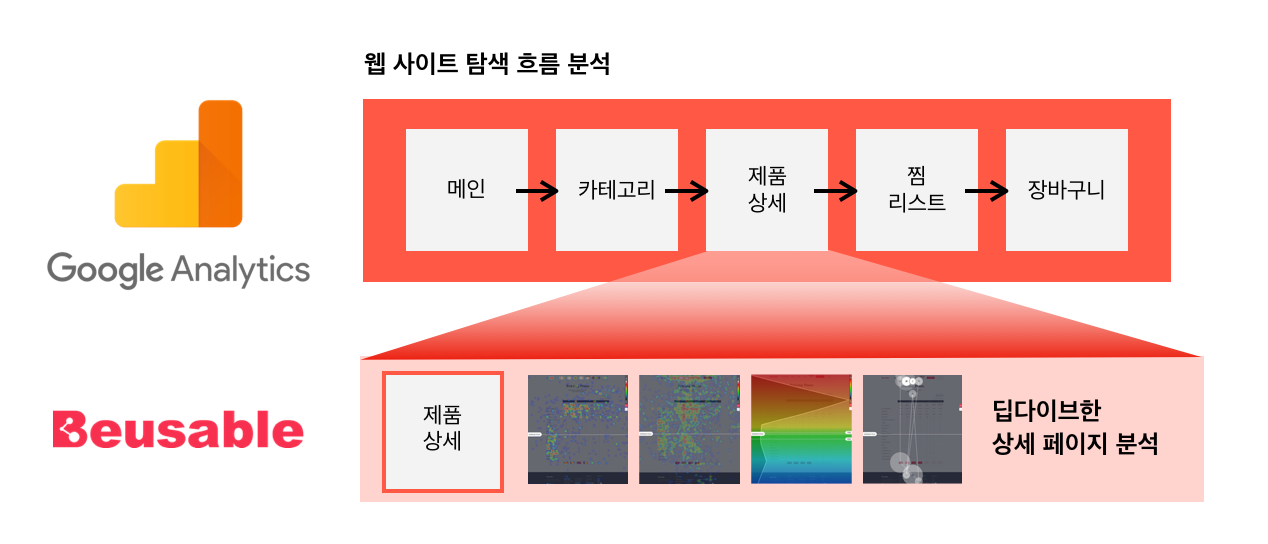 다음으로는 위 사용자 탐색기에서의 행동을 살펴보며 특정 페이지에서 사용자가 왜 그러한 행동을 하였는지를 파악해볼 차례입니다. 뷰저블의 히트맵을 활용할 수 있습니다. 위에서 언급한 예시처럼 사용자가 상세 페이지에서 바로 장바구니로 이동하지 않고 '찜 리스트' 또는 '또 다른 상품 상세 페이지'로 이동하는 경우를 추적합시다.