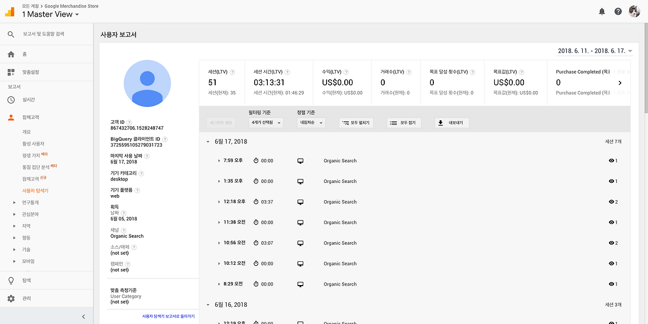 위 목록에서 '고객 ID'로 분류된 목록을 클릭하면 개별 사용자 데이터를 확인할 수 있습니다. 실제 전환 방문자를 '페이지뷰, 목표, 전자상거래, 이벤트' 별로 추적할 수 있습니다.