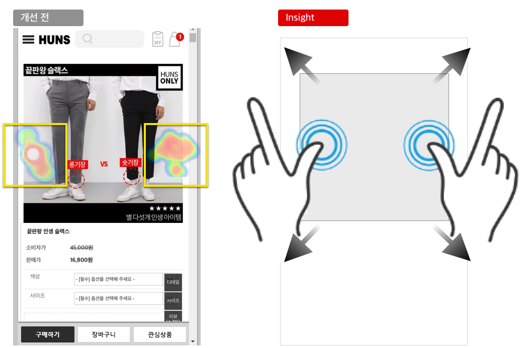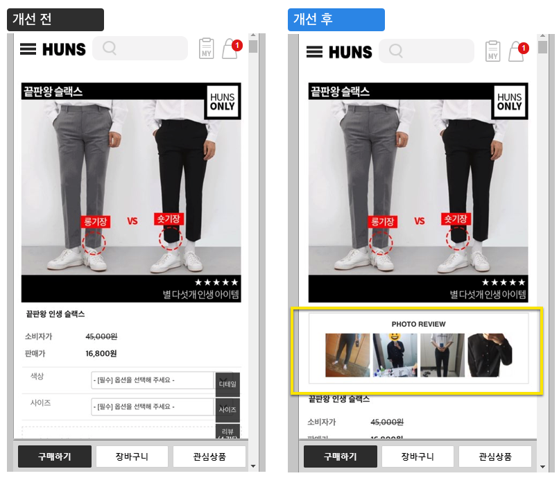 다양한 상세 컷을 확인할 수 있는 여러 장의 썸네일을 Average fold내에 배열함으로써, 상세 페이지의 고객 여정 순서 변경. 자세한 상품 이미지를 빠르게 확인하고 싶어 하는 훈스 고객의 니즈를 UI 배열로 해결.