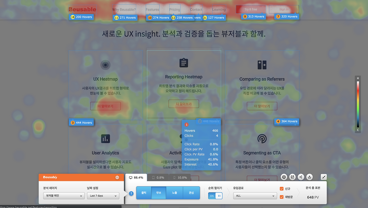 노출 히트맵 : 콘텐츠가 사용자에게 얼마나 노출되었는지를 파악할 수 있습니다.