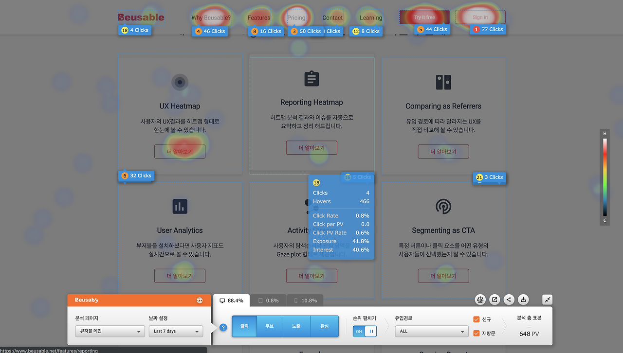 클릭 히트맵 : 사용자의 최종 목적지를 파악할 수 있습니다.