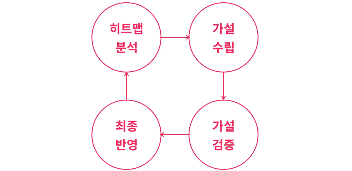 그렇다면 전환율을 높이려면 어떻게 해야 할까요? 전환과 관련된 UI를 개선해야 합니다. 그럼 UI 개선 방안은 어떻게 도출할 수 있을까요? 글 뒤에서 더 설명할 예정인데, 히트맵(Heatmap)을 활용하면 구체적인 사용자의 행동을 파악할 수 있습니다. 히트맵으로 사용자의 행동을 파악하여 데이터에 기반한 가설을 수립하고, 검증 과정에서는 A/B 테스트를 적용할 수 있습니다.