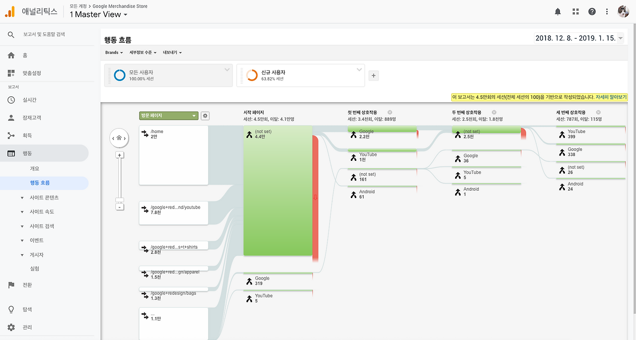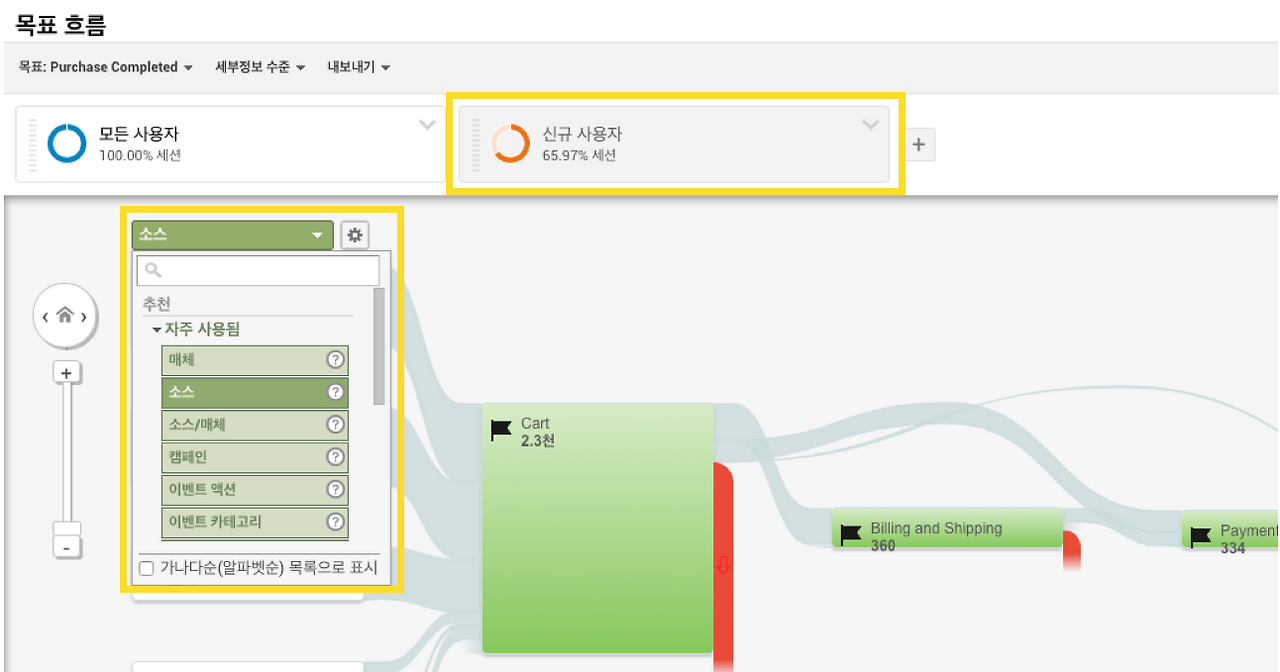 목표 흐름 리포트의 출발점(*위 이미지에서는 '소스')이나 세그먼트(*위 이미지에서는 '모든 사용자')를 바꿔가며 대상 타깃의 흐름만을 따로 추출해 볼 수도 있습니다. 예를 들어 마케터가 집행한 특정 광고를 통해 유입된 사용자의 흐름만을 따로 볼 수도 있을 것입니다. 혹은 랜딩 페이지를 선택하여 웹 사이트 내부에서의 여정을 확인할 수도 있습니다. 여정별로 어떤 차이점이 있는지, 개선점은 없는지, 어떤 콘텐츠를 거쳐 전환에 잇다랐는지 등을 파악해봅시다.