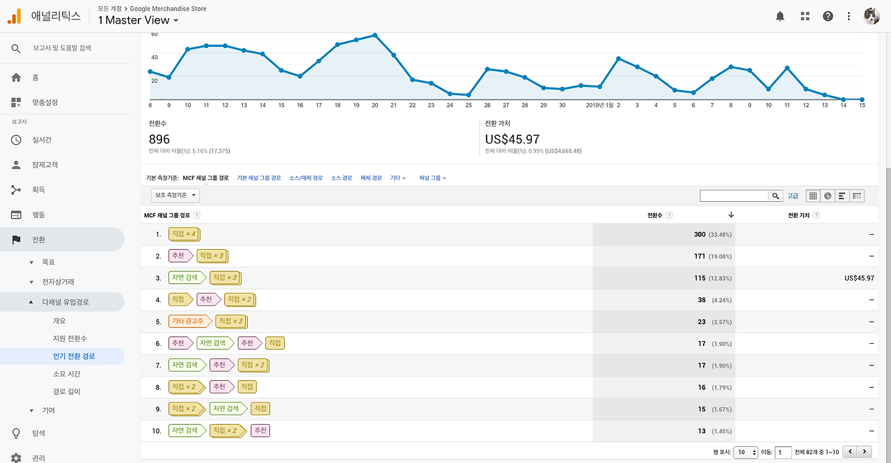 - 위치 : [전환 > 다채널 유입경로 > 인기 전환 경로]