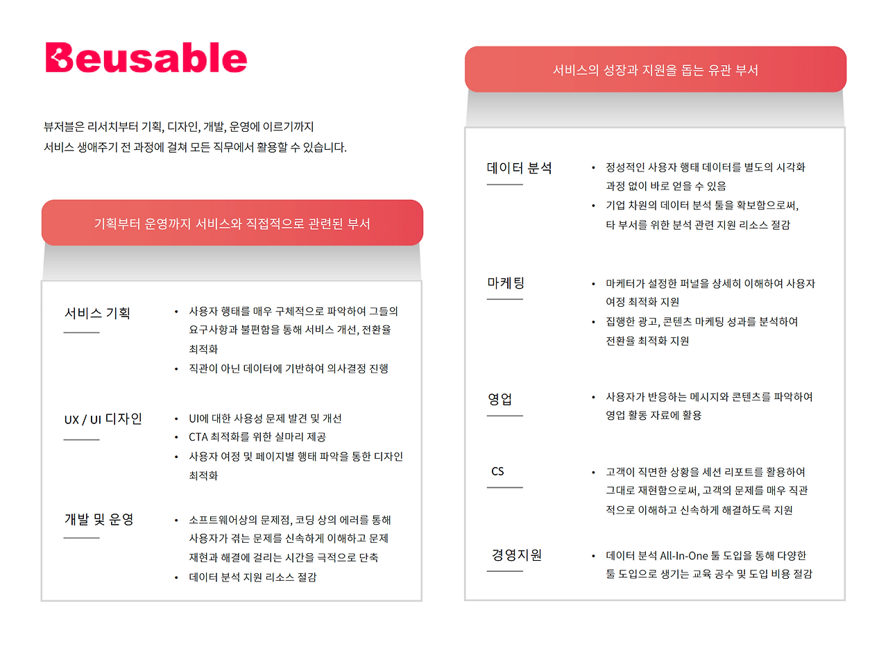 뷰저블과 뷰저블리의 경우 CX 향상을 위해 대다수 대형 고객사에서는 '전사 도입'을 검토하거나 실제 전사 차원에서의 도입을 추진하였습니다. 기획부터 운영까지 서비스와 직접적으로 관련된 부서는 물론, 서비스의 성장과 지원을 돕는 유관 부서까지 뷰저블을 사용합니다.