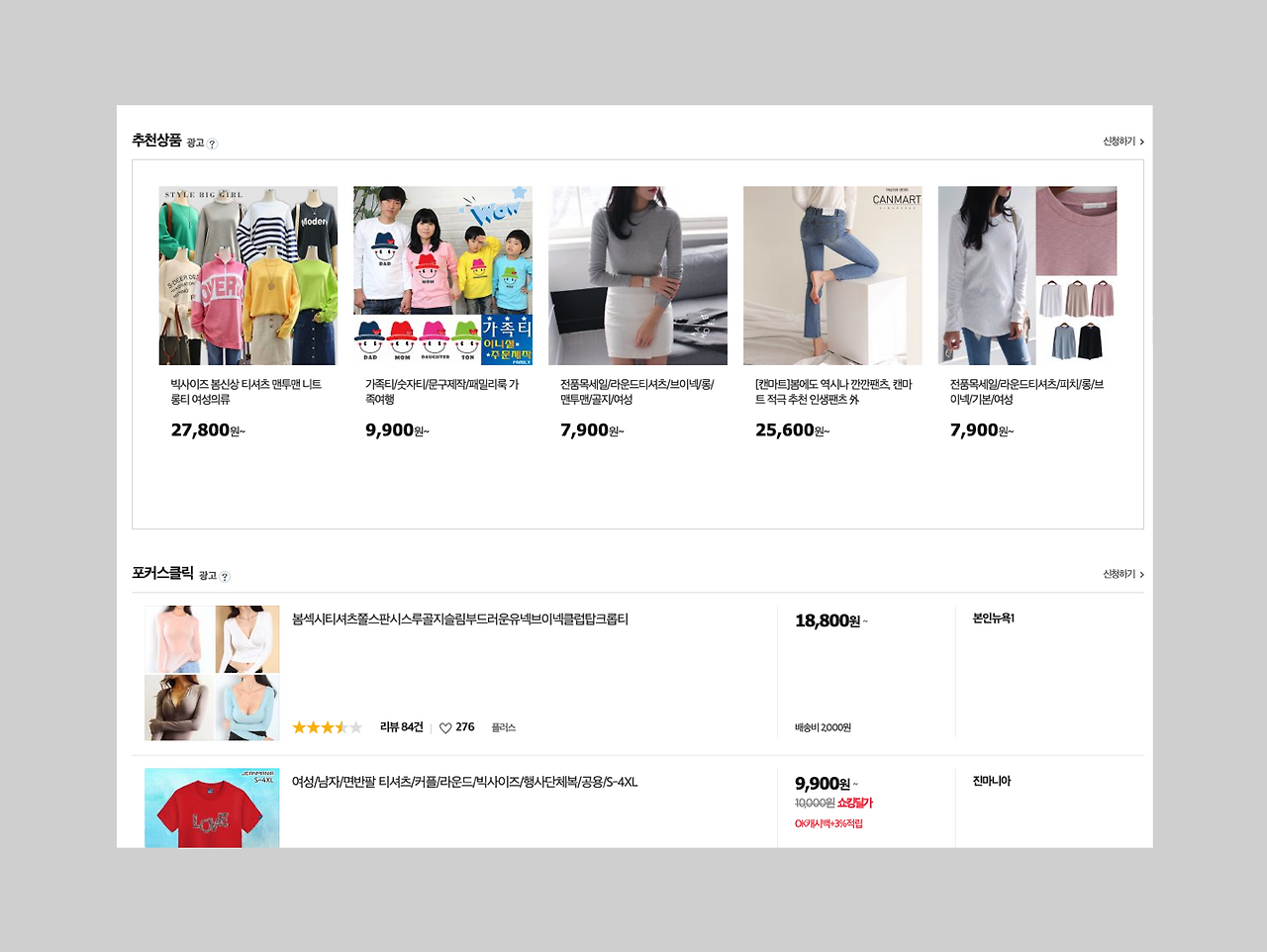 다음으로는 딜, 광고 상품 등의 소비 효율을 살펴볼 차례입니다. 많은 오픈마켓 전자상거래에서 광고 상품을 최상단에 배치하고 있습니다. 11번가 같은 경우는 '추천상품, 포커스 클릭'이라는 이름으로 배치되어있네요.