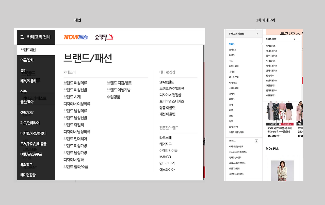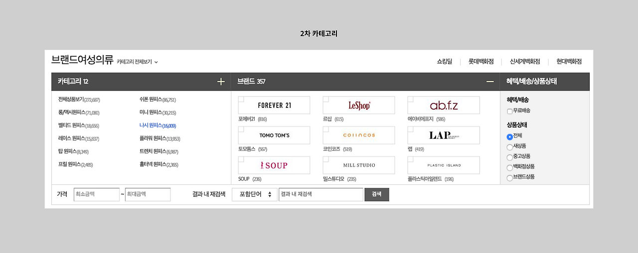 1차 카테고리 페이지에서는 딜 상품, 추천 상품, 테마/브랜드별 상품으로 묶어 보여주고 있습니다. 2차 카테고리 페이지에서는 상품 필터와 함께 TV쇼핑, 백화점 상품으로 분류하여 보여주네요. 필터 UI에서는 브랜드, 사이즈, 가격, 혜택/배송 등의 정보를 필터링할 수 있습니다.