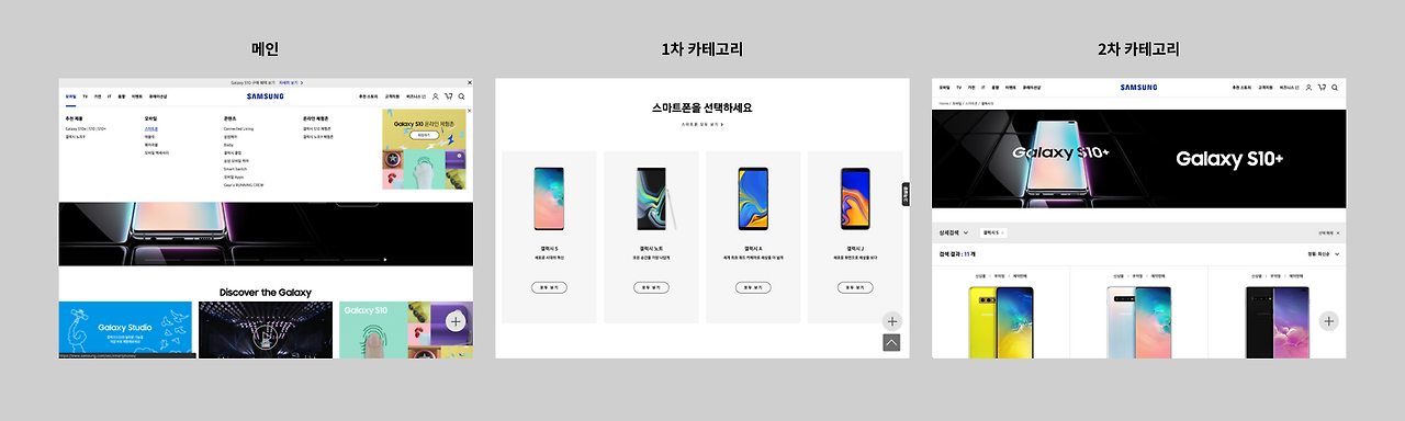 보통 전자상거래 서비스의 User Journey는 [메인 - 카테고리 - 상품 상세 - 장바구니 - 결제 - 결제 완료] 순으로 이어집니다. 여기서 카테고리 페이지는 상품 특성에 따라 여러 상세 단계로 다시 나뉩니다. 삼성전자의 삼성닷컴을 예로 들겠습니다.