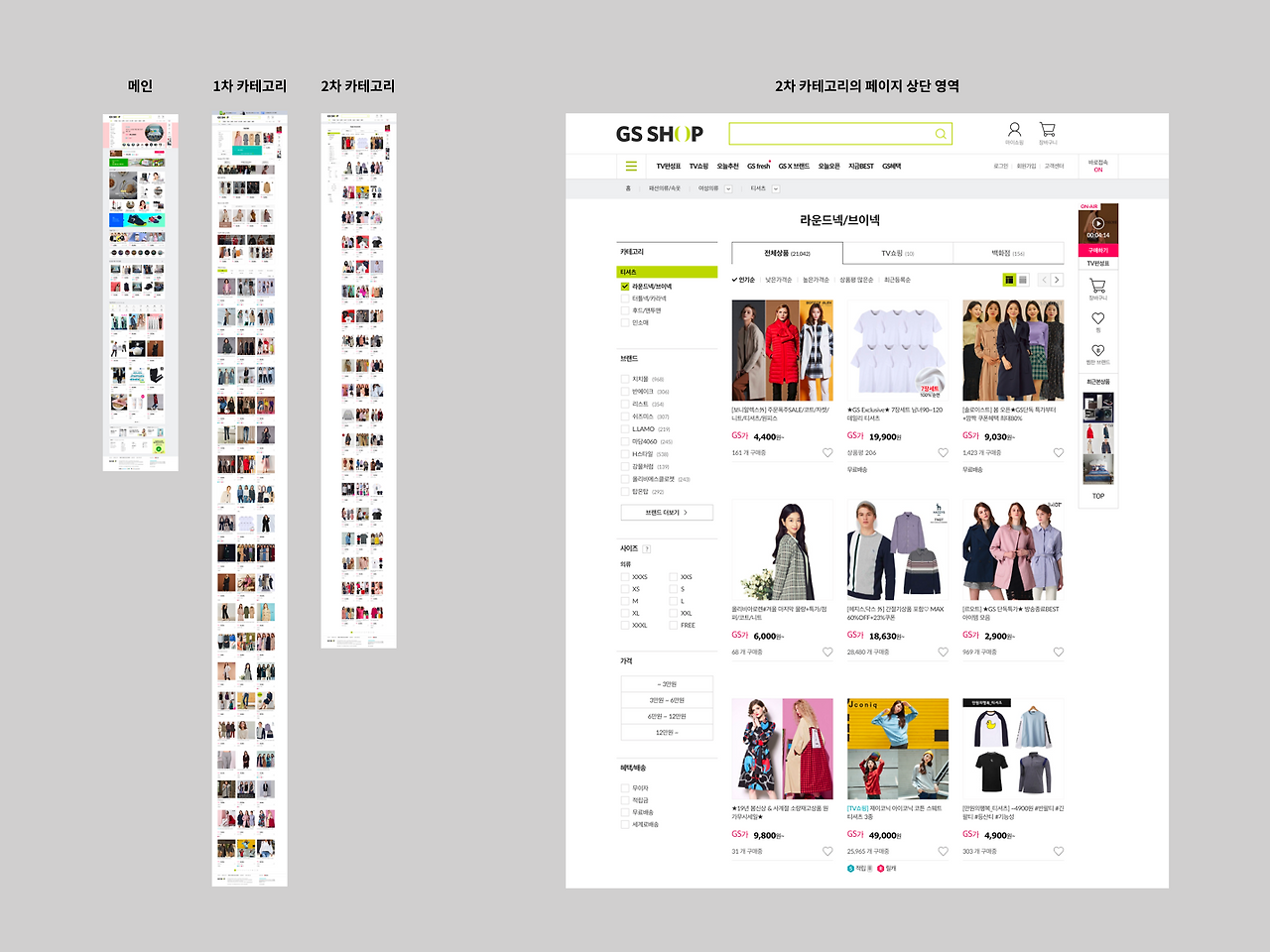 GS홈쇼핑의 GS SHOP 홈페이지로 살펴보겠습니다. GS SHOP에서도 마찬가지로 카테고리 페이지가 여러 개로 분류되어 있습니다. 상품의 종류가 많고 세분화되어 있어 여러 개의 페이지로 분류하여 보여주네요. 삼성닷컴과 마찬가지로 페이지마다 제공되는 상품의 종류, UI의 형태가 모두 다릅니다.