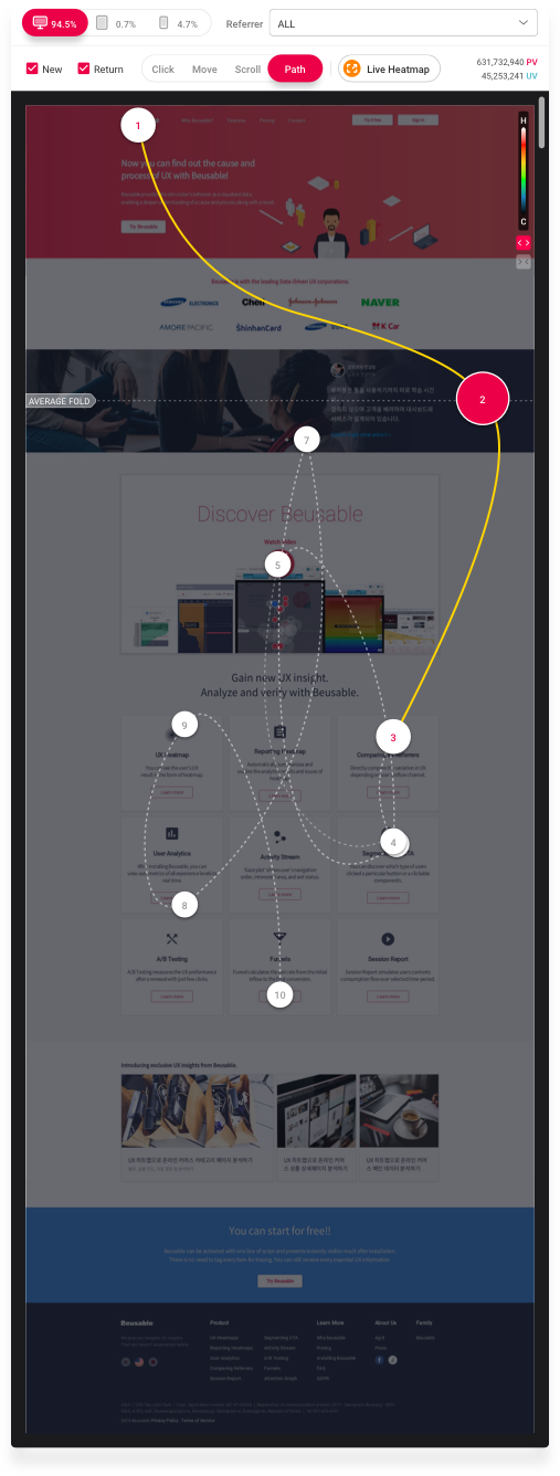 이 외에도 뷰저블을 통해 검색창을 클릭한 사용자의 동선(Path)이나, 스크롤 히트맵을 활용하여 검색결과 페이지의 탐색 심도를 살펴볼 수도 있습니다. 비검색 사용자와 어떤 이용 행태를 보이는지를 비교해보고 다르게 UX 전략을 수립하여 가져갈 수 있습니다.