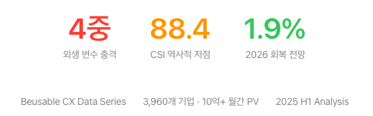 소비자심리지수(CSI)가 100.7에서 88.4로 폭락했습니다. 이것은 단순한 숫자가 아닙니다. 소비자의 구매 의사결정 전체가 '보류 모드'에 들어갔다는 의미입니다. 이 시기에 수집된 모든 행동 데이터에는 '공포에 의한 보류'라는 보이지 않는 필터가 적용되어 있습니다.