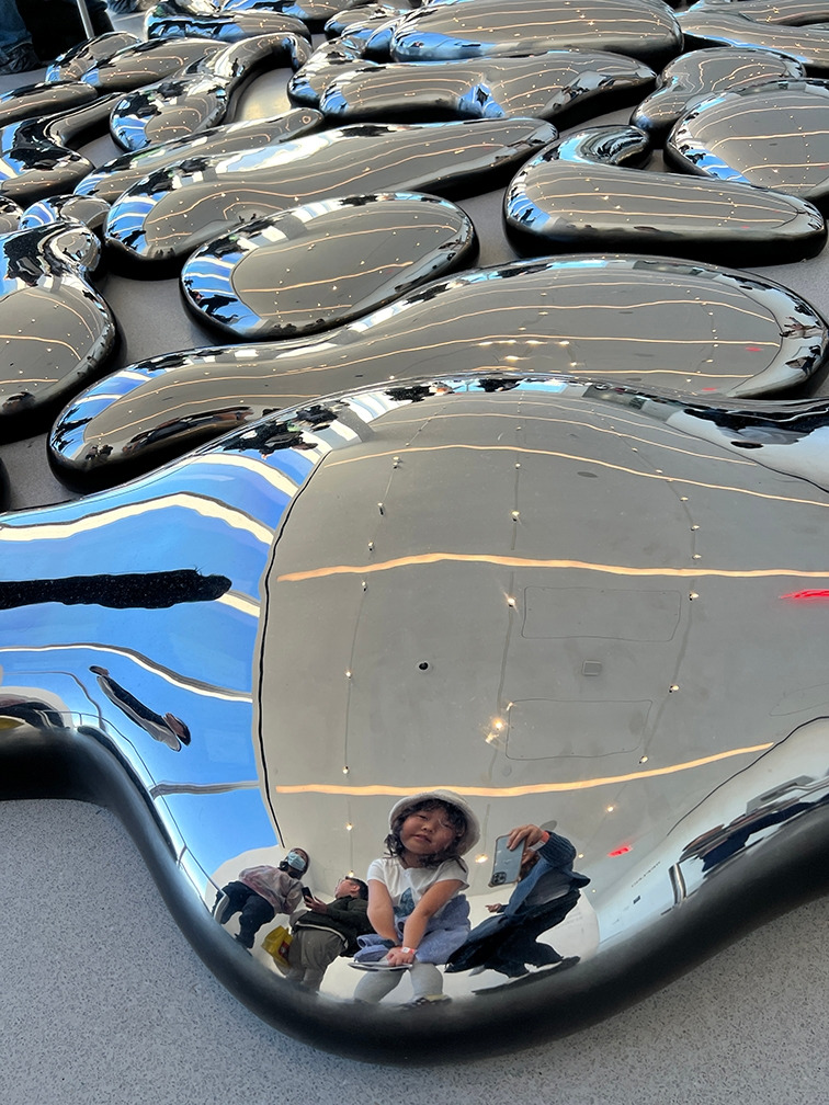 그다음은 거울처럼 나를 반사시키는 실버풍선이 날아다니며 파티분위기를 연출하는 공간이 있다. 이 방도 인기가 많아 입장 전 조금 기다려야 하는데, 다행히 바닥에 전시되어있는 쿠사마 야요이의 아트작품을 보며 무료함을 달랠 수 있다. 그녀의 작품 또한 사물이 반사되는 오브제.