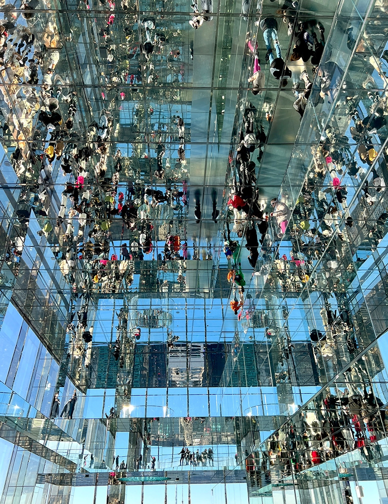 뉴욕에서 자라 뉴욕을 표현한 아티스트가 만든 공간 air에서 바라보았던 그 많은 사람들이 작은 조각처럼 엉키고 연결되어 있다. 마치 만화경 속 같다. 거울로 이루어진 그 공간에서 사람들은 만화경의 작은 조각들이 위치를 달리하며 새로운 패턴을 만들어 내듯, 에어Air 속 사람들도 같은 공간을 매일 혹은 매시간 새로운 느낌으로 바꾸어 준다.