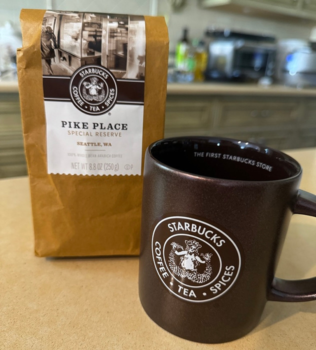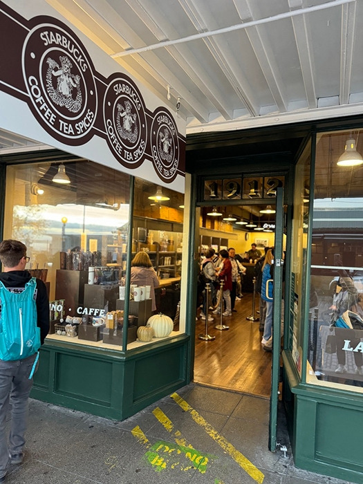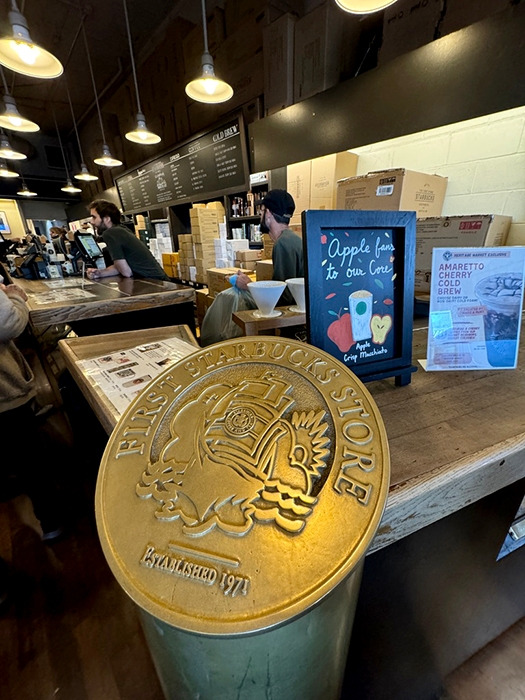 그 시작의 장소에서 여전히 바리스타들이 밀려드는 주문에바삐 커피를 제조하고, 1호점에서만 볼 수 있는 기념품들과 커피원두를 판매했다. 처음 사용했던 지금과 사뭇 다른 브랜드 로고가 가게입구와 기념컵들에 새겨져 있었다. 술 많이 드신 미국 어느 베테랑 어부의 배처럼 배가 불룩하게 나온 인어가 로고에 있어 나중에 집에서 아이들이 깔깔 웃었다.