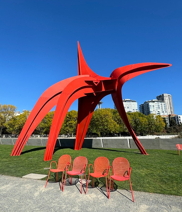 올림픽 조각 공원에는 거대한 조각상들이 곳곳에 있었다. 빨간 의자에 앉아 바다풍경을 바라보고, 조각상 사이로 바닷가산책로를 따라 걸으면 시원한 바람이 얼굴을 쓰다듬고 찰랑찰랑 바닷물 소리가 귀를 간지럽혔다. 잠시 눈을 감고 오감으로 느끼며 걸어보았다.