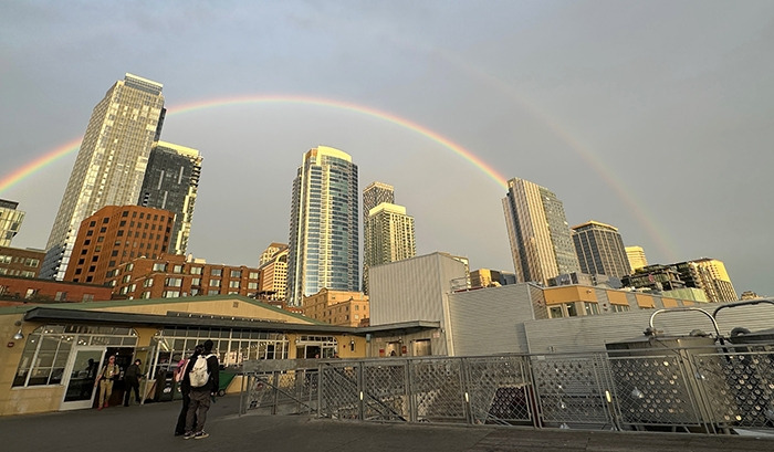 그때 뒤에서 사람들의 와.. 탄성이 들렸고, 돌아보니 우리나라 무지개떡 마냥 선명한 색을 선보이며 예쁜 무지개가 고층 빌딩 사이에 드리워졌다. 처음에 옅던 무지개가 점점 진해졌다.