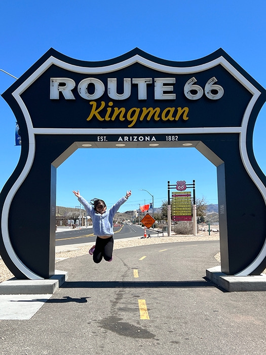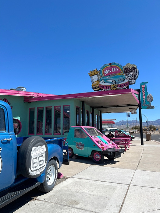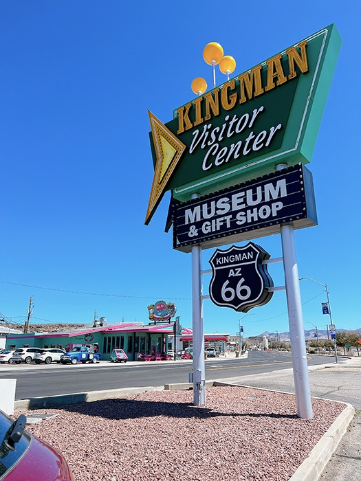 국도 66번은 미국 일리노이주 시카고에서 캘리포니아주 산타모니카를 잇는 길이 약 4000km의 국도다. 당시 미국 최초의 동서 간 대륙횡단 고속도로 중 하나였고, 1926년에 완공되었고 1985년 폐쇄되었다. 각 도시 간 이주를 하며 미국인들 마음의 고향으로 나타나고 있는 장소중 하나다. 그래서인지 여러 영화나 뮤직 비디오 같은 미디어에 자주 노출 되었는데, 한 시대의 문화적 아이콘이었다. 결국 2003년에 복원되어 관광객이나 옛 추억을 떠올리는 미국인들이 여전히 이 도로를 이용하고 있다고 한다. 우리가 방문했던 킹맨에는 66번 국도 박물관과 기프트샵이 있었다. 근처에는 옛 향수를 일으킬 만한 자동차들과 간판들로 레트로 감성이 물씬 풍겼다.