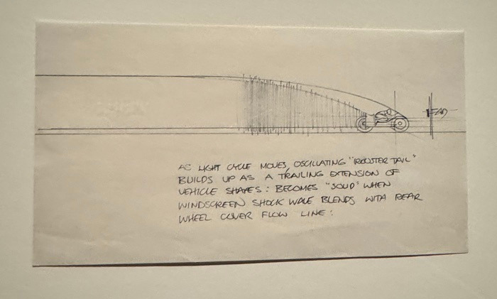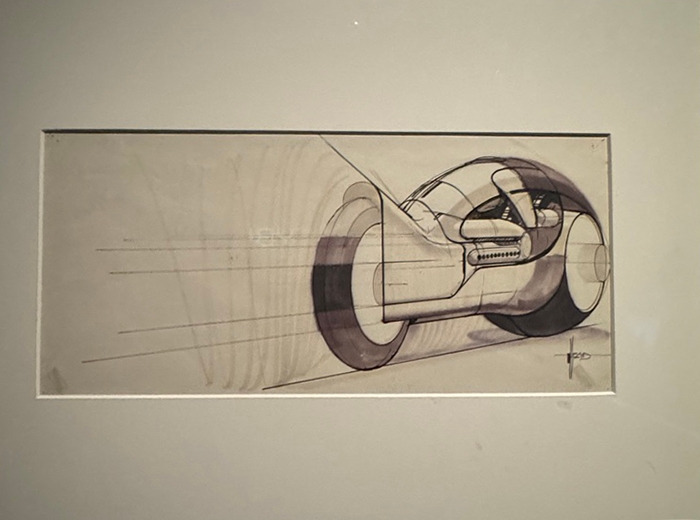 1982년 작 미래형 영화였던 <트론 Tron>의 의상을 입은 마네킹 곁에는 몇 년 전 돌아가신 존경하던 디자이너 '시드매드 Syd mead'의 트론 바이크 디자인 원본 스케치 두장도 벽에 조용히 걸려있었다. 그의 디자인을 따르던 사람이라면 벽에 무심히 걸려있는 작은 스케치를 보면 단박에 그의 선을 알아볼 수 있을 것이다.