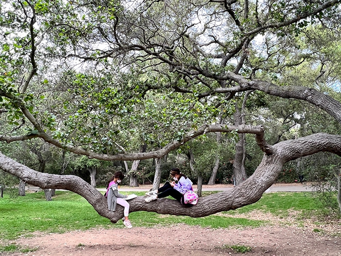 내려오는 길에는 그들의 나무를 찾았다. 그 나무는 작은 나무 정도의 굵은 가지가 바닥 가까이 길게 뻗어 있는데, 그곳에 아이들은 올라타 안거나 누워있길 좋아했다. 그 나무는 항상 자기들의 안식처처럼 찾아가 걸터앉아 책도 읽고 글도 쓴다. 엄마가 다그쳐야 아이들은 그제야 나무에서 내려와 인사를 하고 다시 달려 내려왔다.