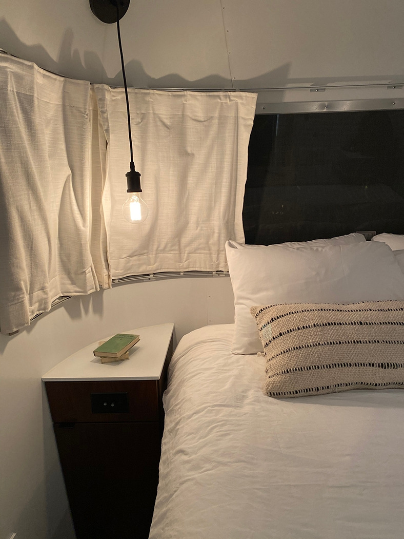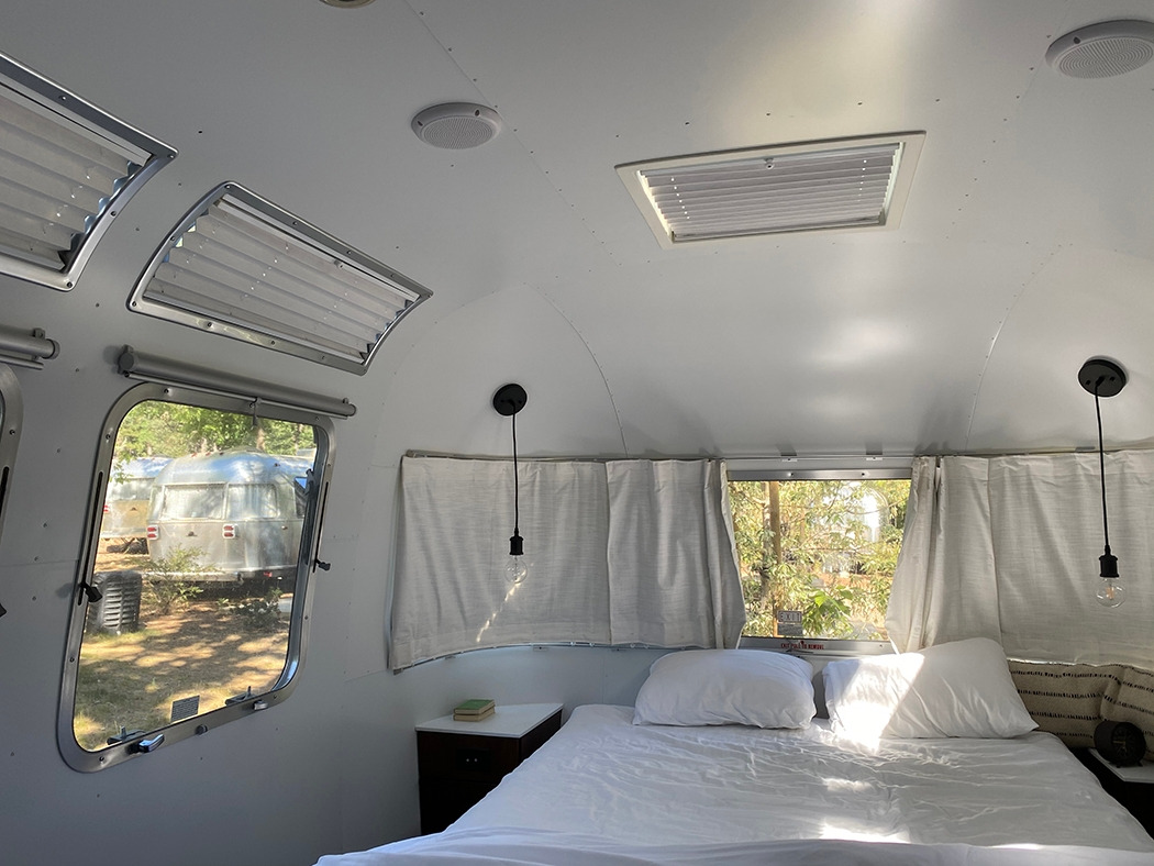 반짝반짝 광이 나는 실버 에어스트림이 나무 중간중간 비치되어 있는 모습부터가 갬성 자체였어요. 내부는 RV카와 비슷해요. 작은 공간에 마치 소꿉놀이를 하는 거 같은 주방 공간. 기본만 할 수 있는 작은 싱크대, 이쁜 머그잔과 수저세트가 커플을 위한 것인양 두 세트씩 준비되어 있고 그외 미니 냉장고, 전자렌지, 약간의 조리기구, 식기류, 커피머신등이 한쪽 벽 붙박이장 안에 비치되어 있어요. 미니멀라이즈한 침실 공간에는 아무것도 없는 듯 하나, 들여다보면 하나하나 신경 써서 고른듯한 문 손잡이들과 전구, 감성 있는 작은 소품과 작은 사진들로 장식되어 있었고, 에어스트림 뒤쪽에 위치한 샤워실과 화장실에도 수건과 목욕 용품들이 정갈하게 정리 되어있어요.