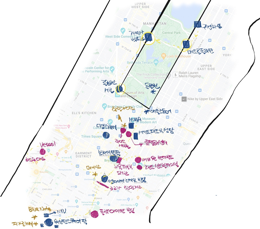 뉴욕시티는 조금 다른 식으로 가이드편을 정리해봅니다. 전문 가이드책이라기 보단 여행 에세이라 친구와 굵직한 뉴욕의 랜드마크에 들르고, 커피잔 들고 수다떨며 이리저리 걸어서 여행하는 느낌으로.. 사실 처음 뉴욕을 방문하는 친구가 오면 그런식으로 관광을 시켜줬었지요. 우린 맨하탄 업타운에서 다운타운으로 내려갑니다. 쉽게 북쪽에서 남쪽으로 내려간다 보면 됩니다.