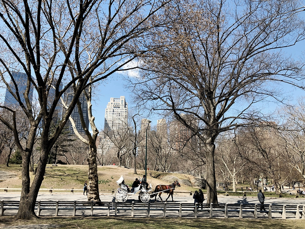 맨해튼 심장부에 위치한 센트럴 팍. 사진은 비록 나뭇잎이 없는 늦가을이지만, 계절마다 그 풍경이 다소 많이 바뀐다. 여름이면 초록 나무가 우거지고, 봄이면 꽃으로 가득하다. 일년내내 언제든 볼 수 있는것은 열심히 달리는 조거(jogger)나 유모차를 끌며 산책을 하는 뉴요커들, 또각또각 거리는 마차를 타고 공원과 시내를 한바퀴 도는 관광객들이다. 따뜻한 날이면 센트럴팍 내에 작은 동물원도 방문할 수 있다. 때로는 아이들이 놀이터에서 스쿠터도 탈 수 있고, 콘크리트 성을 올라가서 연결된 바위위로 기어올라가서 놀 수도 있다. 공원 안에는 아직도 운행중인 오래된 회전목마가 있고, 겨울이면 아이스스케이트를 탈 수 있다. 여름이면 공원에서 재즈나 오페라 라이브 공연같은 이벤트도 한다. 그러면 뉴오커들은 간단한 스넥과 치즈, 와인을 가져가서 각자 편한 자세로 공연을 즐겼다. 점심때 근처 델리가게에 가서 우동과 샌드위치, 혹은 피자등 음식을 사서 친구들과 피크닉을 하듯 바위 위에 앉아 먹어도 즐겁다.