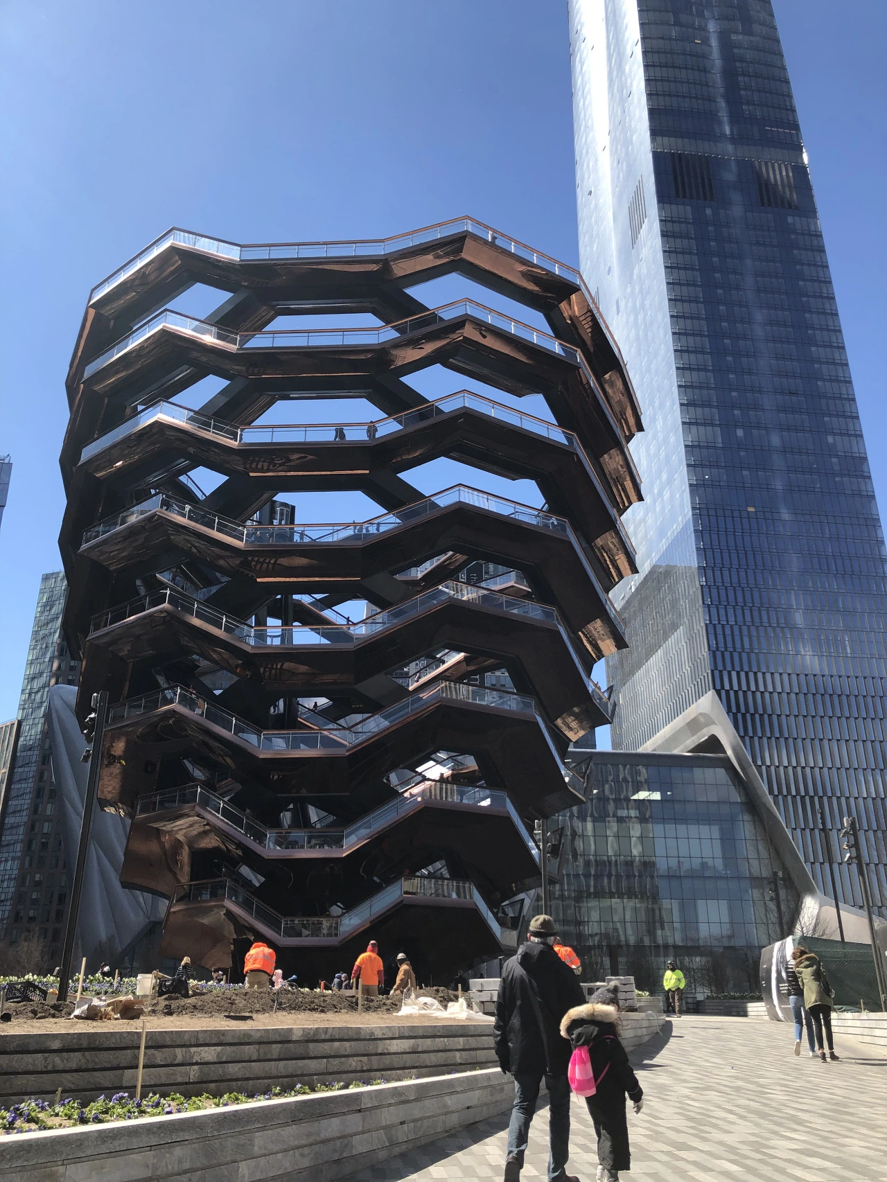 엠피아어 스테이트 빌딩에서 서쪽으로 가면 허드슨 야드에 위치한 베셀 (Vessel) 이 나온다. 베셀은 2019년개장한 예술적인 건축물이다. 154개 층계들과 총 2500개의 계단, 80개의 서서 머무를 수 있는 랜딩장소가 있는, 높이 46미터 벌집 모양의 현대적인 건축물이다. 랜딩장소에 서면, 각 장소마다 사방으로 트인 허드슨 경관을 볼 수 있다. 강바람이 몰아쳐서 사실 높은 곳은 조금 무섭기도 했다. 층계를 오르다보면 마치 내가 큰 예술 작품안에서 돌아다니는 작은 인간 같았다. 건물에 외벽에 반사되어진 경치들과 내모습 또한 작품의 한 부분으로 느껴졌다. 못 내 아쉬운 점은, 이 곳에서 투신하는 사건이 있어서 잠정 폐쇄중이라고 한다. 자살 방지 시스템이 만들어 진후에야 다시 오픈할 지도 모른다는 뉴스가 전해졌다. 그 소식을 듣고, 갓 개장했던 몇년전 방문했던 것이 다행이다 싶은 마음이 들었다. 매서운 뉴욕의 강바람을 후려치게 맞은 후에 바로 건너편 몰에 들러 따뜻한 커피 한잔을 권해본다.