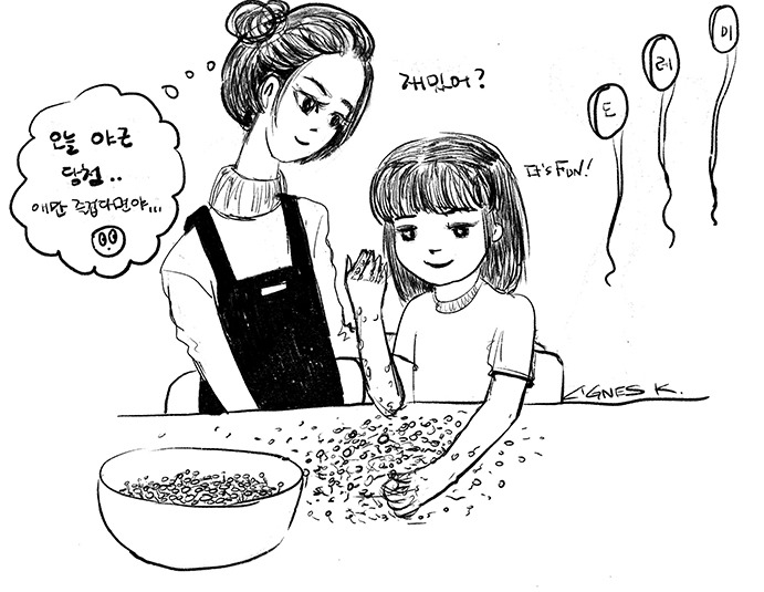 함께 콩나물을 다듬고 싶어서 두 눈을 반짝이며 나를 쳐다 보았다.