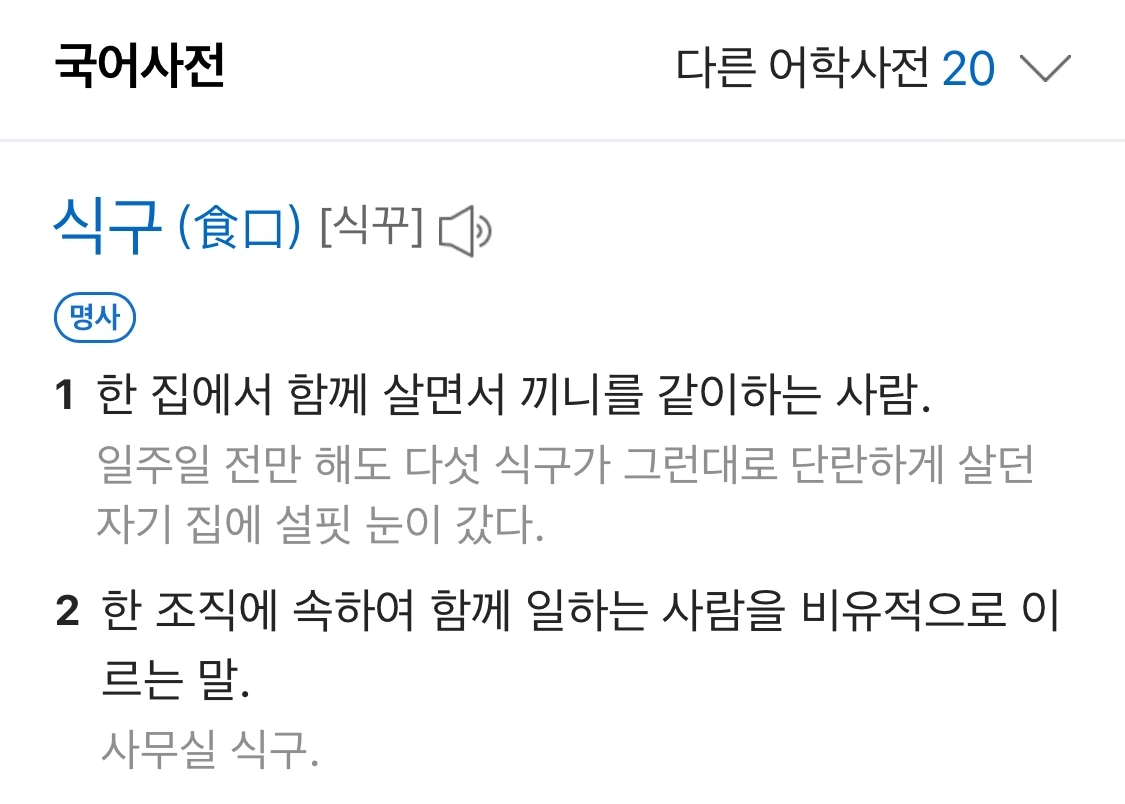 오늘 그 장면이 생각나서 과연 사전에서는 어떻게 말하고 있는지 찾아봤다. 네이버 검색 결과 '한 집에서 함께 살면서 끼니를 같이하는 사람.'이란다. '한 조직에 속하여..'의 의미는 오늘 내가 하고 싶은 이야기가 아니니까 첫 번째 의미만 취한다. 혹시 몰라서 내가 갖고 있는 '교학사' 국어사전을 찾아보니 역시 동일하다. 그렇다. '식구'라는 말은 '끼니를 같이하는 사람'이다.