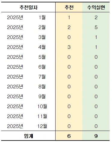 2025년 한 해 동안 총 6개의 기업을 분석하였고, 그중 9개 종목이 수익 실현으로 이어졌습니다.