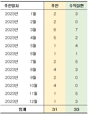 2023년 한 해 동안 총 31개의 기업을 분석하였고, 그중 33개 종목이 수익 실현으로 이어졌습니다.