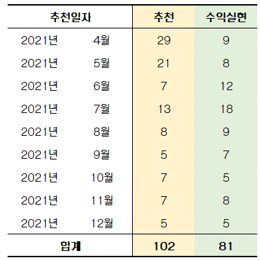 그중 79개 종목은 실제로 수익 실현에 성공했고, 나머지는 아쉽게도 기대에 못 미쳤습니다.
