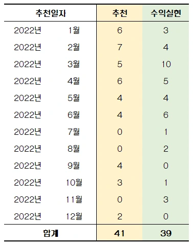 2022년 한 해 동안 총 41개의 기업을 분석하였고, 그중 39개 종목이 수익 실현으로 이어졌습니다.