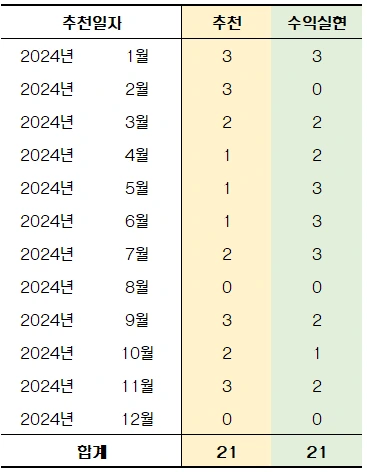 2024년 한 해 동안 총 21개의 기업을 분석하였고, 그중 21개 종목이 수익 실현으로 이어졌습니다.