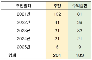 총 201개 분석 기업 중 183개 종목 수익 실현!