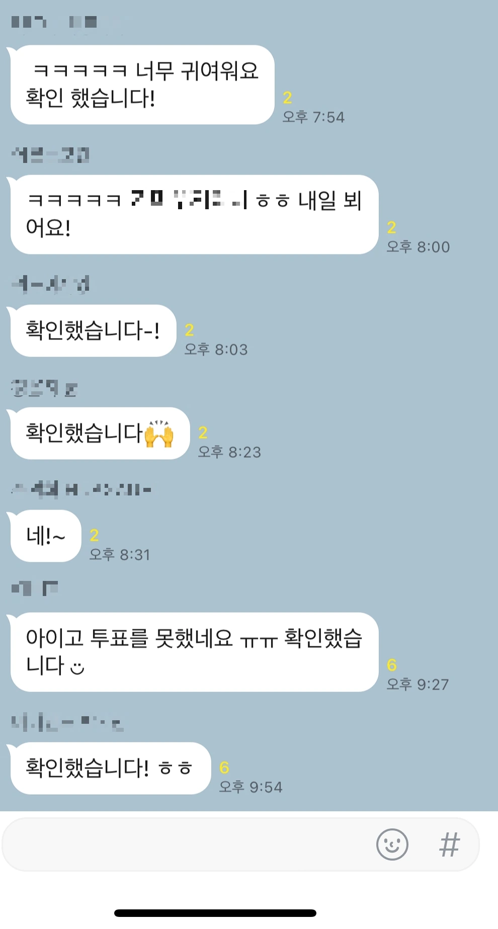 총회가 내일이라서 오늘 ZEP 스페이스 한 번씩들 들어와 보시라고 안내를 보냈더니 이게 귀여워서 그런가? 예전에 비해서 반응이 되게 좋네요ㅎㅎㅎ 답장도 많이 해주시고... 좋았어. 귀여운 걸 좋아하시나 봐요. 하긴 저도 그렇거든요.