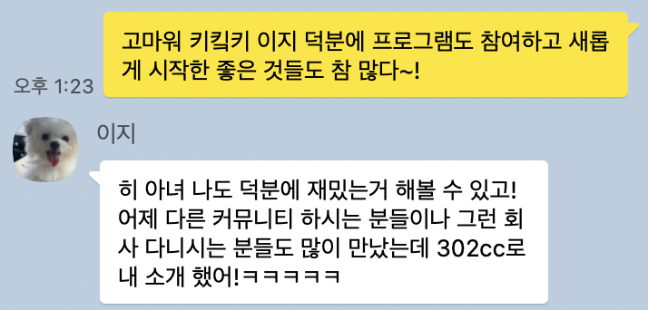 (이지) 네 잘 마무리 했습니다. 평소에 참 좋아하던 커뮤니티인 뉴그라운드의 코파운더 지혜님을 멘토로 만나고, 다른 커뮤니티를 만들려는 기획자 분들과도 알게 되고, 커뮤니티 기획,모집,운영 등의 노하우도 배운 의미있는 시간이었습니다. 이게 다 베이 덕분이죠!