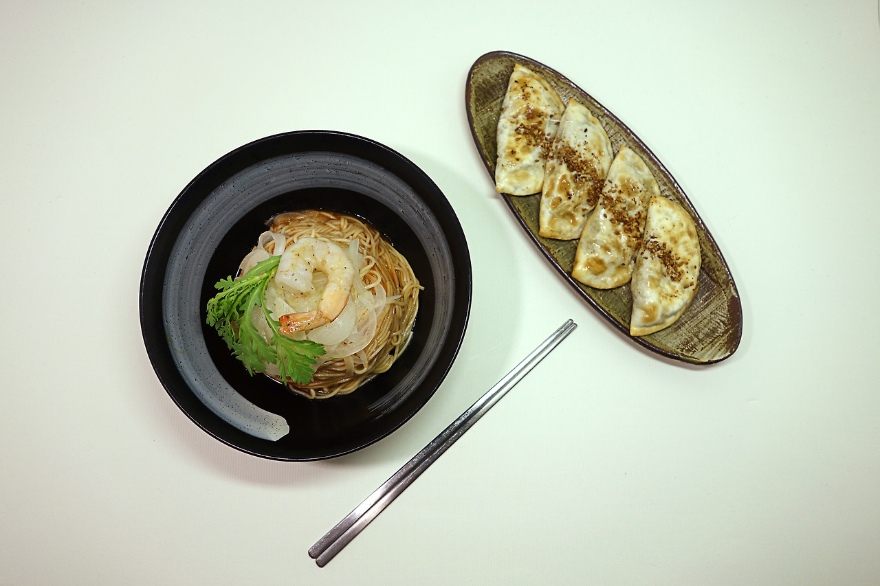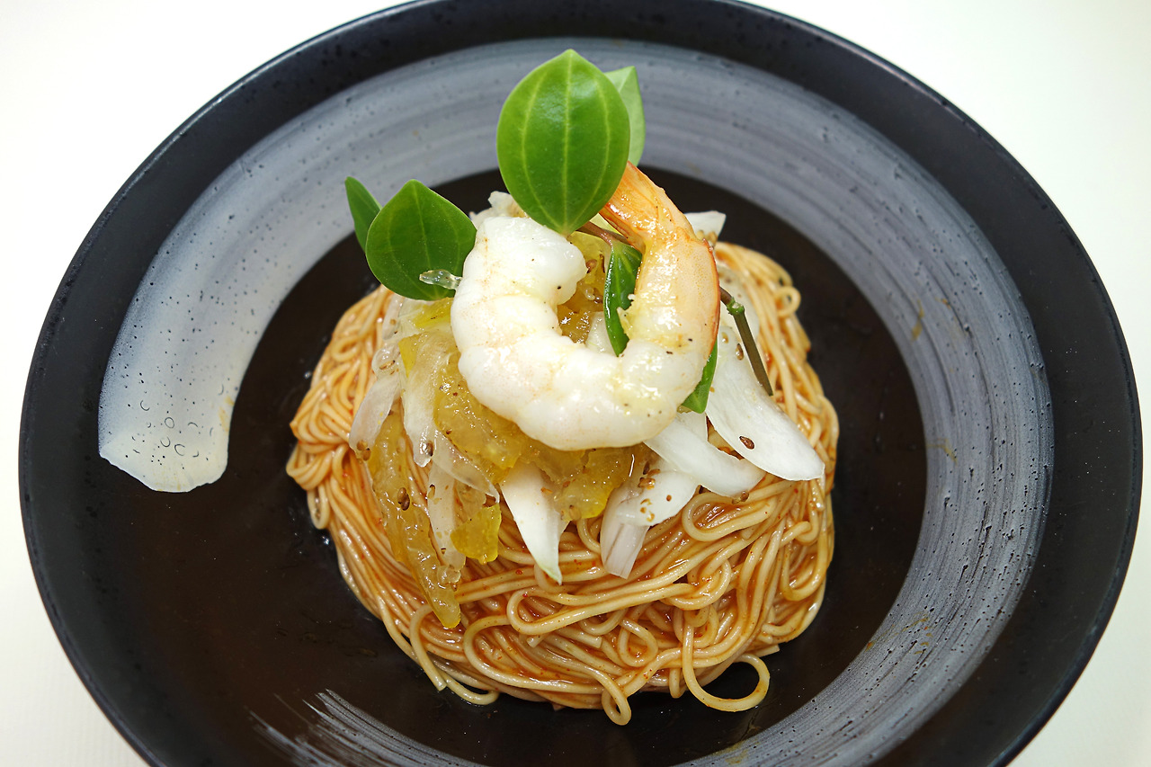 5. 면과 소스를 비벼 그릇에 담고, 2에서 무친 것과 새우, 쑥갓을 올려 장식한다.