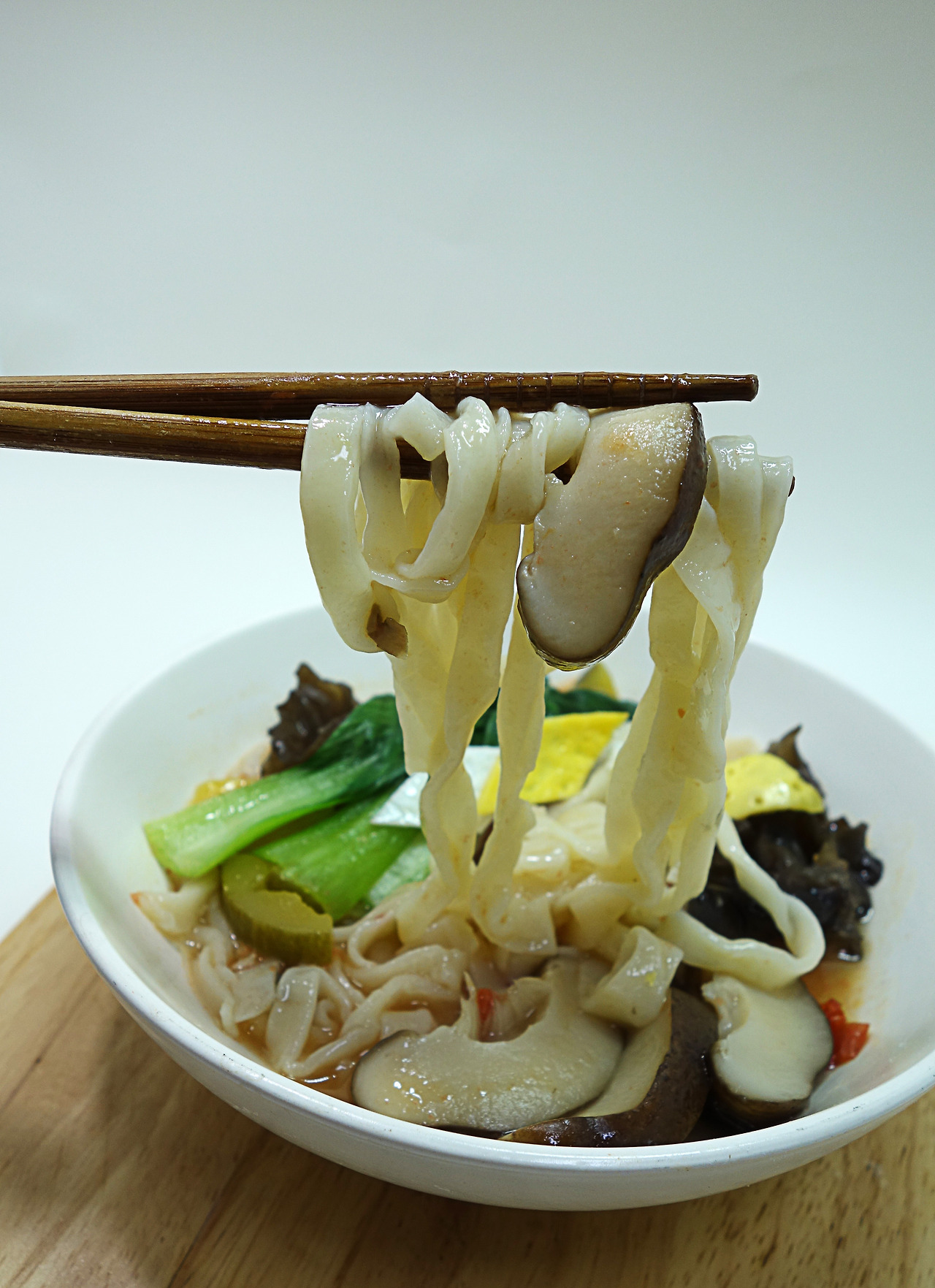 Knife-cut noodle with tomato, mushrooms, and several vegetables