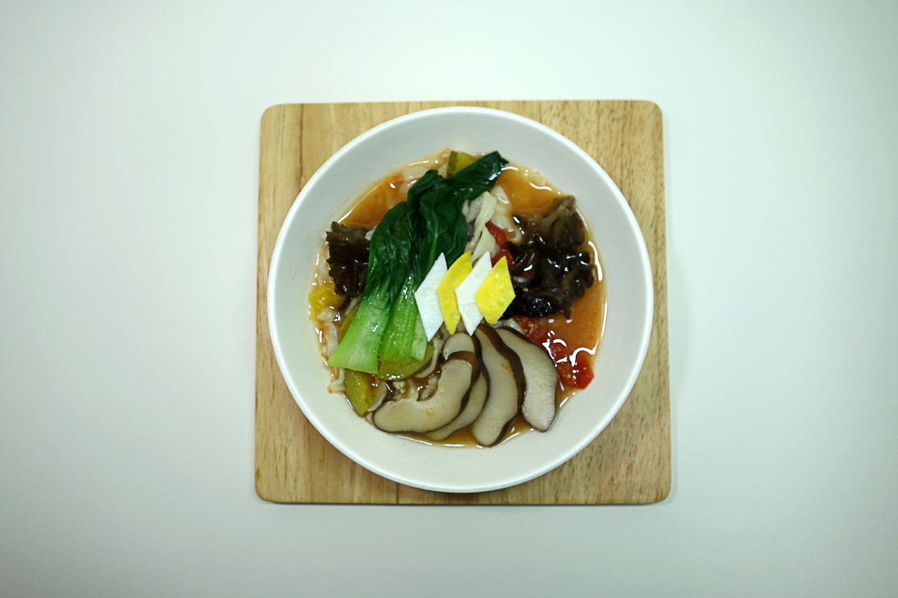 밀가루, 가쓰오부시, 다진 마늘, 방울 토마토, 표고버섯, 느타리버섯, 목이버섯 , 소금, 후추, 계란, 애호박, 청경채
