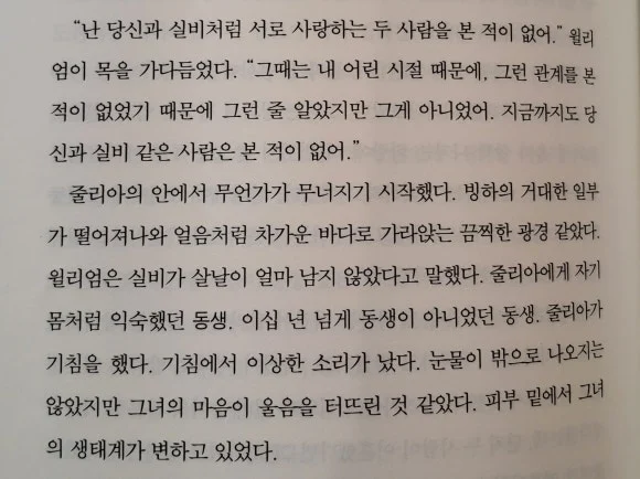 마지막 페이지를 덮은 뒤 가장 오래 마음에 남았던, 마음이 갔던 인물은 줄리아였다. 한 몸처럼 지내던 동생 실비, 그리고 전남편 윌리엄과의 관계 속에서 선택하든, 선택할 수 없었든 여러 인연과 점점 멀어져야 했던 그 긴 시간들이 정말 안쓰러웠다. 그 오랜 시간 틈틈이 찾아왔을 외로움과 소외감, 분노와 후회와 연민. 그냥 복합적인 감정을 홀로 견뎠을 그녀가 느껴졌다.