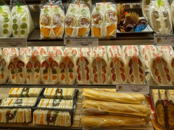 디저트의 도시답게 예쁘고 고운 빵들이 즐비한 모습에, 빵순이 원, 투, 쓰리에 도넛킬러 남편까지 행복한 쇼핑이 예정되어 있었다. 식사빵류인 호밀빵, 치아바타, 베이글과 통식빵부터 색색의 크림빵, 페이스트리, 바게트 샌드위치, 각종 파이와 타르트, 싱싱한 딸기, 포도, 키위, 파인애플 등 과일에 생크림을 듬뿍 바른 샌드위치, 거기에 화려함과 고급스러움의 정점 케이크류와 일본 전통 디저트까지..! 눈이 쉴 틈이 없었다. 행복한 고민이 시작되었다. 여기저기 찬찬히 살펴보고 심사숙고 후 가장 먹고 싶은 빵으로 하나씩 골랐다. 개수에 제한을 두지 않으면 몇 개씩 고를 남편 때문이다. 한창때 그는, 크리스피 도넛 혹은 초코파이 한 박스를 앉은자리에서 해치웠다고 한다. 빵을 사랑하는 한 사람으로서 아이러니하게도, 아이들에게는 아빠의 식성을 물려주고 싶지가 않다.(참고로, 나는 야채, 해산물, 해조류, 고기, 과일 등 골고루 잘 먹으며 건강한 식단을 기본으로 유지하는 편이다. 단지, 빵과 디저트를 유독 사랑하는 것뿐.) 남편은 많이 나아지긴 했지만 여전히 '섭취의 다양성과 영양성분' 면에서는 내 기준에서 많이 부족한 수준이다.