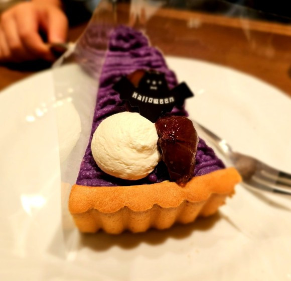 매장 분위기는 고급스럽고 스태프분들의 서비스 응대와 친절도가 매우 훌륭했다. 직원분들과 인사를 몇 번을 했는지, 투철한 직업정신에서 나오는 친절함이겠지만 기분이 참 좋았다. 드디어 타르트와 음료가 서빙되었고 천천히 음미하며 즐기고 싶었지만 현실은 10분도 안 걸린 7분 컷이었다. 개인적으로 과일이 들어간 디저트류를 선호하지 않는데 여기 샤인머스캣 타르트는 맛있었다. 행복이와 사랑이는 어떤 타르트가 더 맛있냐고 물었다. 남편은 샤인머스캣, 구황작물 애호가인 나는 역시나 몽블랑(Mont Blanc_이탈리아와 프랑스에서 처음으로 만들기 시작한 케이크의 한 종류로 밤을 주재료로 만드는 디저트) 핼러윈 타르트였다.