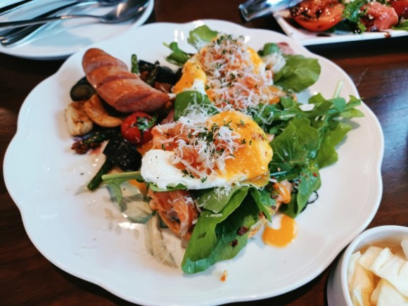 버섯과 샐러드는 연어와 디저트를 먹기 위한 빌드업이다.
