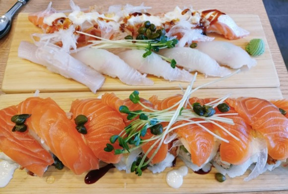 몸무게를 유지하기 위해서기도 하고, 빵을 좋아하기도 해서 밥은 많이 먹지 않는다. 하지만, 여기 연어초밥과 연어롤 앞에서는 어쩔 수가 없다. 특히, 연어롤은 하나가 거의 주먹만 한데 한 접시를 다 비운다. 대식가인 남편도 여덟 개를 다 먹기 힘들어하는데 그 어려운 걸 내가 해낸다. 사장님도 놀래고 남편은 경탄하고 친구는 박수를 쳐주었다. 대사량이 부쩍 떨어진 요즘은 양심상 주로 점심에, 조금씩 먹고 있다.