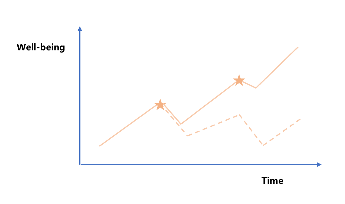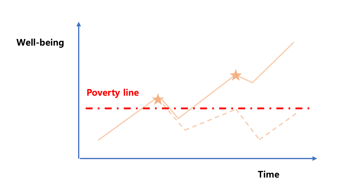 Resilience를 강화하지 못하고 위기상황을 맞이한 프로젝트의 결과를 더욱 직관적으로 보여주고자, 아래 그래프에서는 빈곤선(Poverty line)을 그어보았다. 첫번째 위기상황(★)이 오기 전엔 대상자들은 개발프로젝트를 통해 절대빈곤에서 벗어난 삶을 누릴 수 있게 되었다. 하지만 위기상황이 발생하자 대상자들은 다시금 빈곤선 아래로 생활 수준이 떨어지게 되고, 간신히 회복하는 듯 보였으나 또다른 위기로 인해 다시 빈곤선 아래에 놓이게 된다. 결국, 아래 그래프 실선에 해당하는 프로젝트 대상자들은 절대빈곤에서 벗어나지 못한다. 하지만 Resilience 강화를 목적으로 둔 프로젝트 대상자들은 첫번째 위기상황에서 다시금 빈곤선 아래로 떨어지지만, 곧 회복하여 빈곤선을 훨씬 상회하는 웰빙 수준을 유지하게 된다.